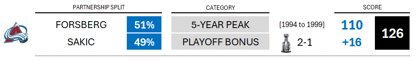 An MVP award each, two Stanley Cups, and five electric playoff showdowns with Detroit are engraved on this iconic pairing. If not for Forsberg’s physical ailments and splitting titles with those Red Wings, dynasty status was highly attainable in Colorado.