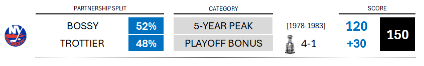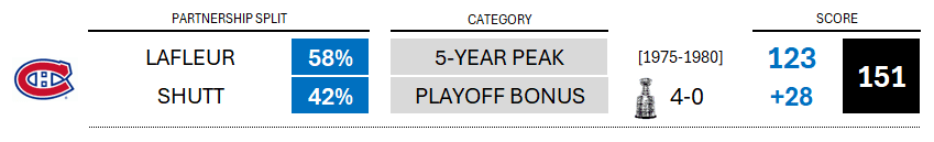 Bossy and Trottier inherited the belt from Lafleur and Shutt, fresh off four straight Cups themselves. It was a different time for parity, to say the least. This pair fits our five-year peak score perfectly as its fire blazed bright for exactly five years. Lafleur, a rock star in Montreal (well, disco star at least), scored at least 125 points each season for a half-decade.