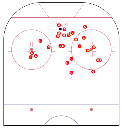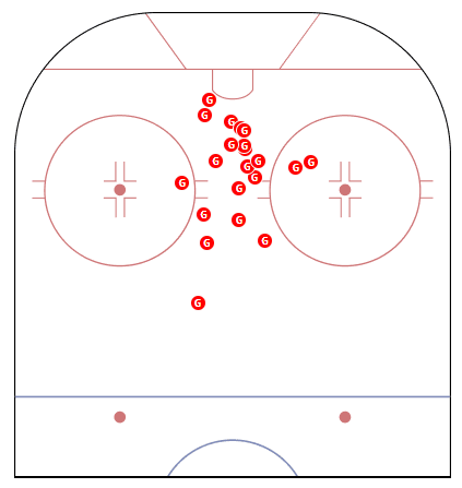 So far this season Dadonov has two shots on the power play, both coming from well outside. Below is a chart of where all 20 of his power-play goals have come from dating back to the 2017-18 season.