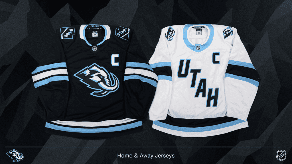 Utah’s inaugural color palette will remain – termed as Black Rock, Salt White and Mountain Blue – along with the original colors and striping from their first-year jerseys. It’s the Mountain Mammoth logo that will adorn the Black Rock home jersey, with U-T-A-H scripted across the Salt White away jersey – so there will be no confusion in visiting arenas about where the Mammoth hail from.