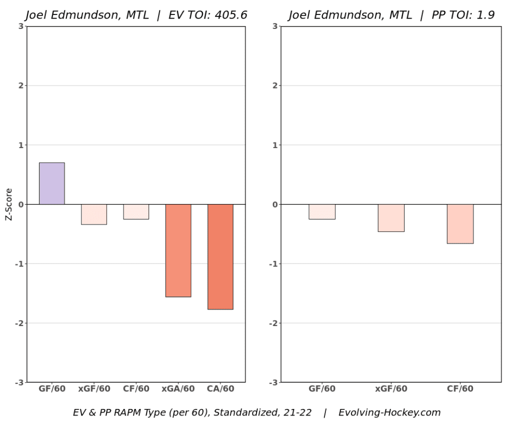 Edmundson really struggled defensively when he did return to the lineup, as he finished last season with a 42.15% shot attempt share and a 40.99% expected goal share at even strength. It was his worst season by far in this regard, as while he doesn’t drive the bus in his pairings, he can usually play well enough to not hold a team back if they are a good team, which the 2021-22 Canadiens were not.