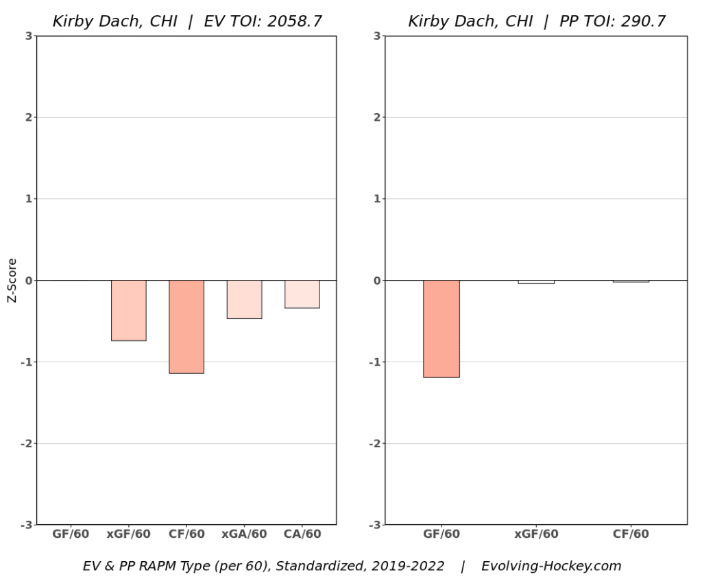 Those struggles continue on the defensive side of the ice as well. He has a 45.73% shot attempt share and 45.59% expected goal share at even strength so far in his career, although playing for an uncompetitive Blackhawks team certainly doesn’t help. Those numbers are also weighed down a bit by playing with Patrick Kane, who has his own struggles with driving play, but then that also is a concern for Dach’s scoring if he can’t put up points with a strong playmaker like Kane.