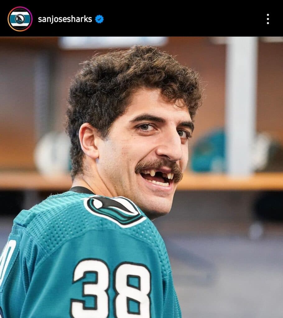 MY TAKE: Whoa. Hold the phone. Ferraro’s look has a whole vibe. From the mustache itself, to the missing teeth, to the hair: it’s almost surreal. A direct nod to the Derek Sanderson era of the NHL. Ripping darts between periods. Going for lunch beers after practice. Putting dentures in someone else’s drink just to get a laugh. I didn’t think anyone could beat Skinner. But somehow Ferraro has done it. The San Jose Sharks defenseman is the King of Movember.