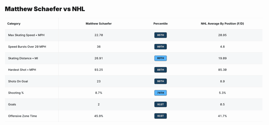 It’s way too early to compare Schaefer’s long-term trajectory to someone like Makar or Hughes. But comparing him to others his age over history – there isn’t a single other 18-year-old defender in the NHL – it’s about as impressive a start as we’ve ever seen.