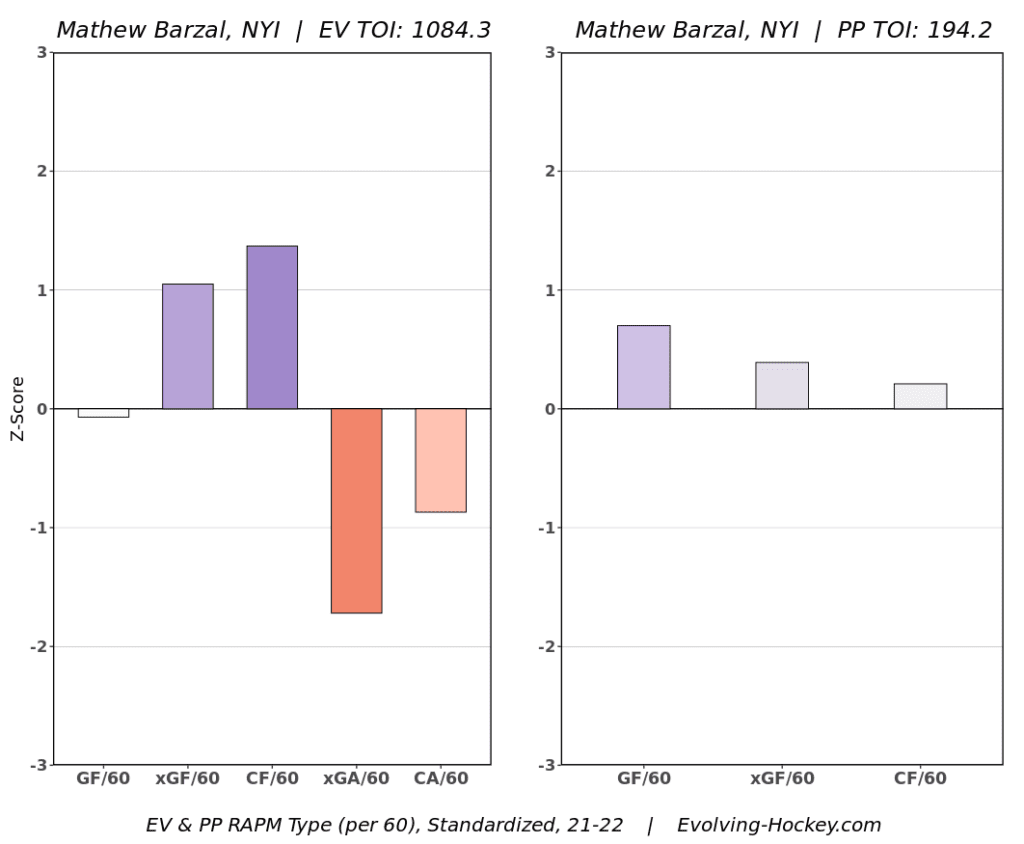 Barzal also saw some defensive struggles last season, although he’s never been known as an elite defender. At best, he doesn’t hurt your system if it’s a strong defensive one, but since the Islanders struggled last season in that regard, so did Barzal. He finished the 2021-22 season with a 49 percent 5-on-5 shot attempt share and 48.89 percent 5-on-5 expected goal share, brought up by his offensive ability more than the defensive side of his game.