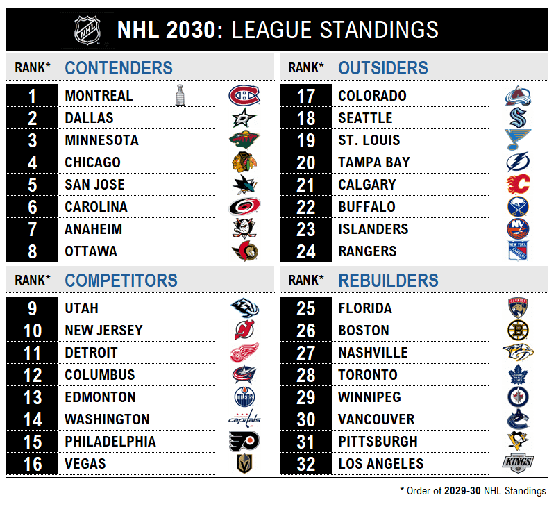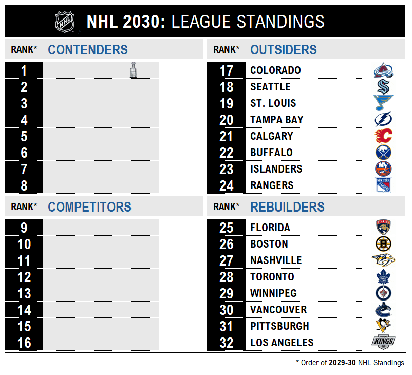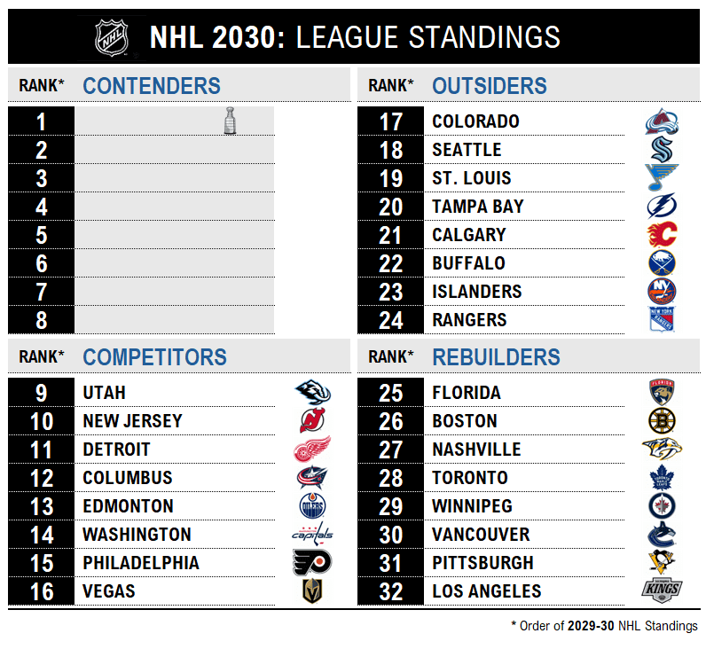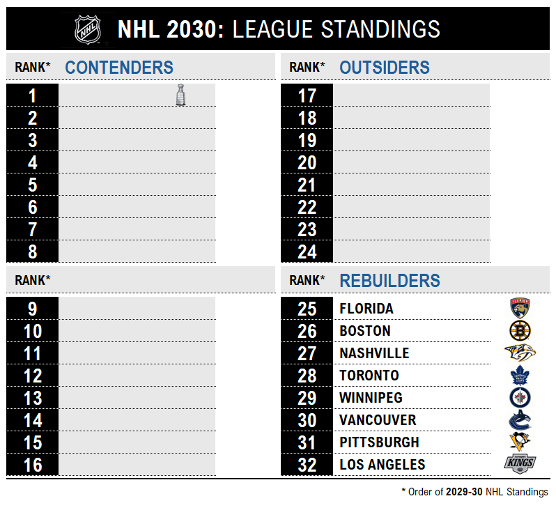 While speculation is inevitably part of the exercise, we have a solid foundation in the present. All 32 teams will be tiered and ranked: Rebuilders (32nd to 25th); Outsiders (24th to 17th); Competitors (16th to 9th); and Contenders (8th to 1st). The rankings represent the forecasted NHL standings for the 2029-30 season, with the top-ranked team the de facto pick for the 2030 Stanley Cup.