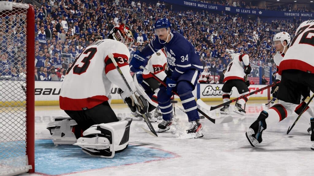 A slight visual refresh beyond some shaders and shadows and such would be nice. It doesn’t even have to be much different – just something a bit more tailored to the new-game experience. On a smaller note, the shadows looked nice, but it was glitchy when playing outdoors and got annoying as a goaltender trying to track a shooter down the wing.