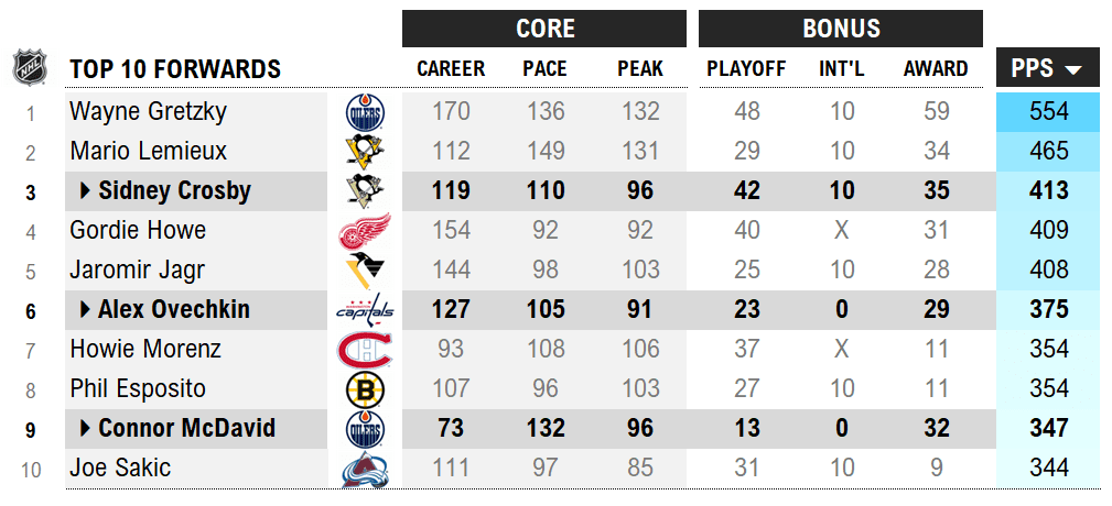 #3. Sidney Crosby (Age: 37): It took Crosby 19 point-per-game seasons, but he’s created a cushion on Howe and Jagr. As long as a player’s production doesn’t fall off completely (think Jeff Carter last year), their Career score is designed to rise faster than their Pace score. So, Sid is locked in as the #3 forward in PPS. Overall, he has no path to catch Lemieux, but does lead his old landlord in Career, Playoff, and Award value.