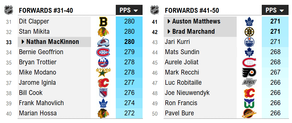 #42: Brad Marchand (36): No need to call the exterminator… this versatile pest is where he’s supposed to be. For once. It’s hard to see Marchand ranked this high and not question the model’s validity, though. I get it. Tied with Jari Kurri? But once you roll back the mandatory dislike for Marchand and level the offensive climate, you get these 82-game scoring averages:
