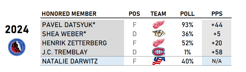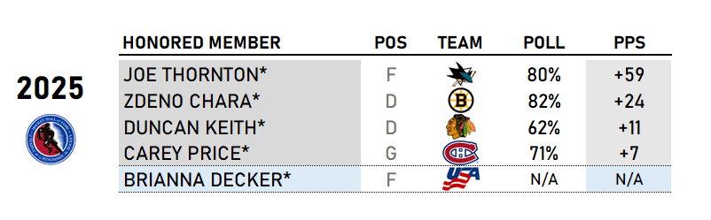 The Prediction: Choosing wisely in 2024 is important because there might be no room for holdovers next June. 2025 is shaping up to be an all-timer — each of Thornton, Chara, Keith and Price exceed the PPS standard at their position and polled above 60%. It could be the first instance all four male players were elected first-ballot since 2009 and just the third time ever. And should American scoring sensation Brianna Decker be inducted, it would be the first time five players were chosen on their first try.