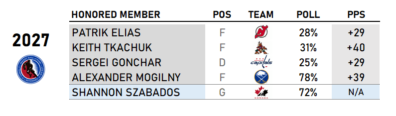 The Prediction: There’s a projected lull in clear choices as Pavelski (43%) and Backstrom (24%) are the only newcomers polling above 9%. So, the Committee gets room to tidy up oversights in 2027. Each of the four Dead Puck Era guys is part of an overlooked generation. Elias, a two-way threat, was the top scorer on three Devils’ teams that reached the Cup Final. Tkachuk — yes, Matthew and Brady’s dad — had 10 seasons of 35+ goals when adjusting for era. Countrymen Mogilny (78% polling!) and Gonchar (the top eligible defenseman in PPS) are among the Hall’s most glaring omissions. Szabados, the pioneering Canadian stopper, played against men at the junior, college, and pro levels.