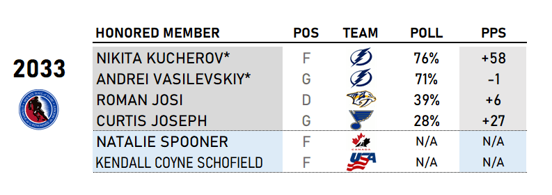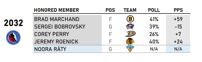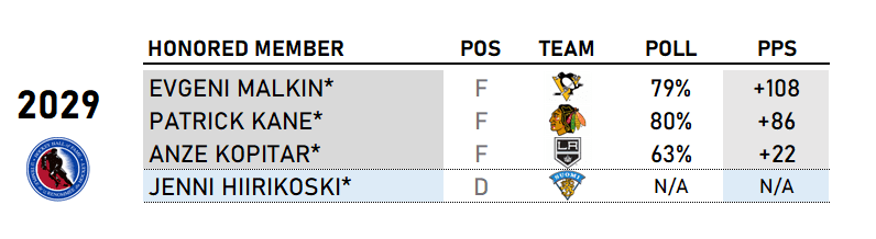 Newly Eligible (retired 2 years ago): Joe Thornton, Zdeno Chara, Duncan Keith, Carey Price, Brianna Decker, Ryan Getzlaf, Tuukka Rask, Jason Spezza, P.K. Subban