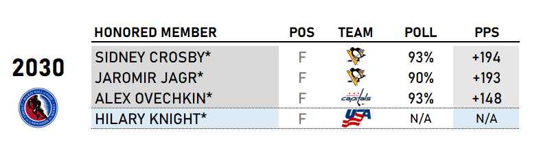 The Prediction: While the retirements date surely won’t line up in reality, the Class of 2030 would be a hot ticket. By PPS, you’ve got the current #3, #4 and #6 forwards of all-time potentially retiring at once. The assumptions? The tireless Crosby will finally tire, ending his career how it began — on a rebuilding Penguins team. Jagr (4 assists in 15 games this year on the Kladno team he owns) will finally say goodbye at age 55. Ovechkin, the new goal king by 2026, will play one forgettable year back home and retire at 41. Norris winners Karlsson and Doughty get in the next cycle.