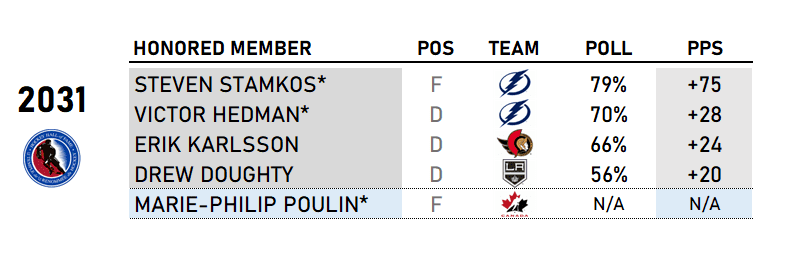 The Predictions: We’ll combine the final three classes given how deep the predictions are at this stage. The quick hits: Poulin is the star attraction of 2031, the greatest female honoree since Hayley Wickenheiser (2019); four Lightning mainstays get elected in three years; and the 2032 speeches featuring Marchand, Perry, and Roenick make the Hall’s gatekeepers extra nervous for an evening.