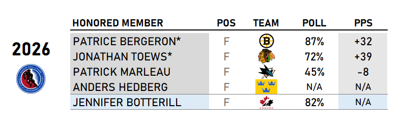 The Prediction: Brilliant all-around forwards Bergeron and Toews will headline the Class of 2026. At 82% approval rating, serial winner and dominant scorer Jennifer Botterill (13-2 in 15 major events from 1999 to 2007) will finally get her curtain call. In his third year of eligibility, all-time games leader Marleau will be inducted. Players like Marleau with long careers and big totals (see Dave Andreychuk) typically find their way to the plaque room eventually. Finally, I’m throwing out a dart on Anders Hedberg, a respected Committee member since 2012. He’d be approaching the maximum 15-year term limit and could see his unique, trailblazing hockey life rewarded.