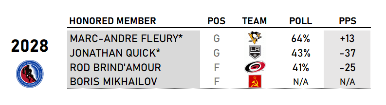 The Prediction: While I’ve never backed Quick’s candidacy (his career save percentage is league average), the public is more bullish. He and beloved 1,000-game club member Fleury would headline the festitivies. By 2028, Brind’Amour will be a decade deep coaching competitive Carolina teams and the Committee will blur some lines to get him inducted. Mikhailov, a star on the Soviet 1972 Summit Series team, is a token choice for an underrepresented era in European hockey. The female player spot is empty, so Cassie Campbell-Pascall can deservingly be elected as a Builder in 2028.