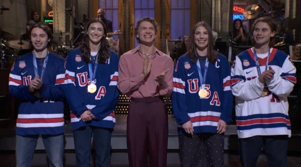 Seattle Torrent forward Hilary Knight and Boston Fleet defender Megan Keller, along with Jack and Quinn Hughes of the NHL, all took the stage wearing their USA Hockey uniforms and Olympic gold medals during actor Connor Storrie’s opening monologue on last weekend’s episode of Saturday Night Live.