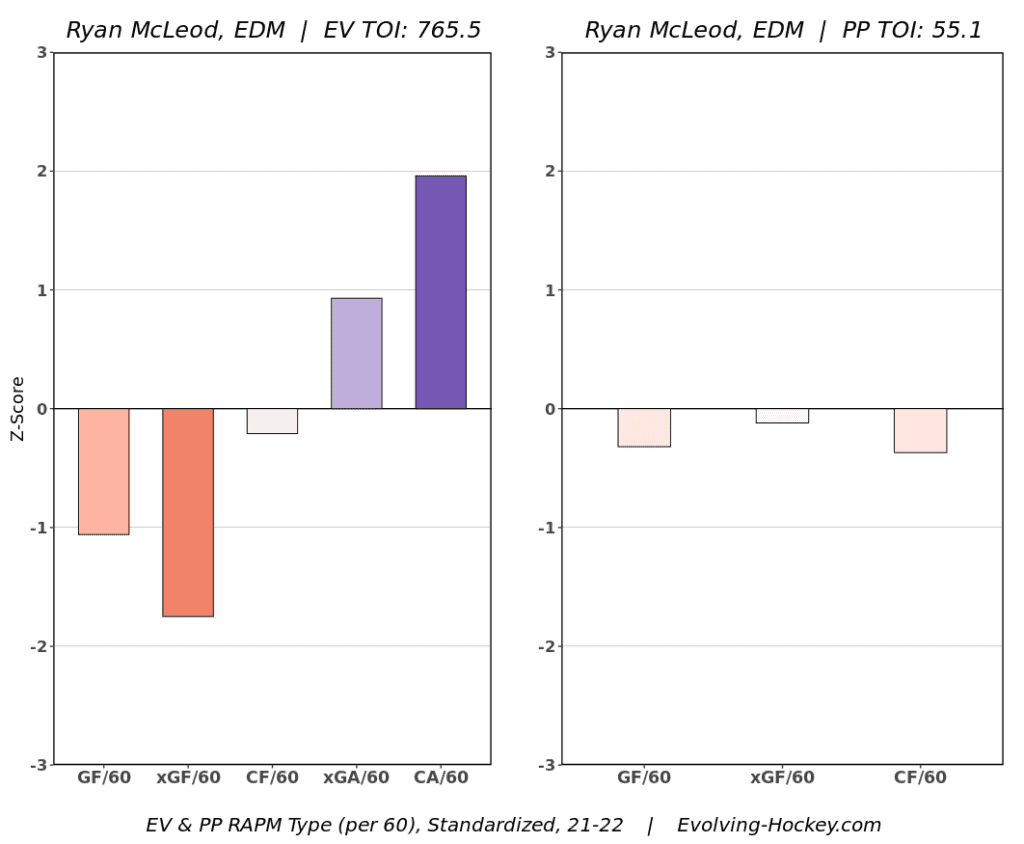 McLeod proved to be even more valuable on the defensive side of the ice, establishing himself as a strong defensive forward in his minutes, which isn’t something you see from a rookie. He finished the season with a 53.57% shot attempt share and 47.44% expected goal share at even strength, although his expected goal numbers are weighed down from his time alongside Leon Draisaitl, who despite elite point totals has struggled in that regard throughout his career.