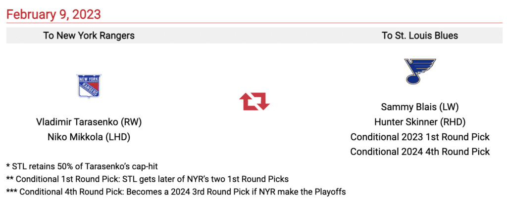 — Frank Seravalli (@frank_seravalli) February 9, 2023According to The Athletic‘s Arthur Staple, the Rangers received Tarasenko and defenseman Niko Mikkola from the Blues in exchange for a conditional 2023 first-round pick, a conditional 2024 third-round pick, forward Sammy Blais, and defense prospect Hunter Skinner.