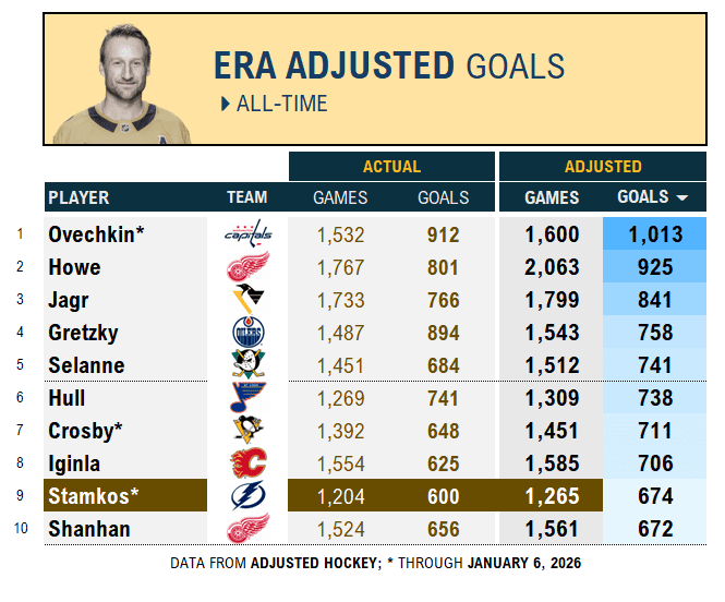 When we adjust for era — scaling stat lines to a neutral scoring climate with 82-game schedules — Stamkos leaps from 22nd to 9th in career goals. Relative to his own time, only eight players in 109 years of NHL hockey have outscored ‘Stammer.’ And he isn’t done yet. Despite a slow start, he’s scoring at a 36-goal pace and has over 200 potential games left under his current contract.