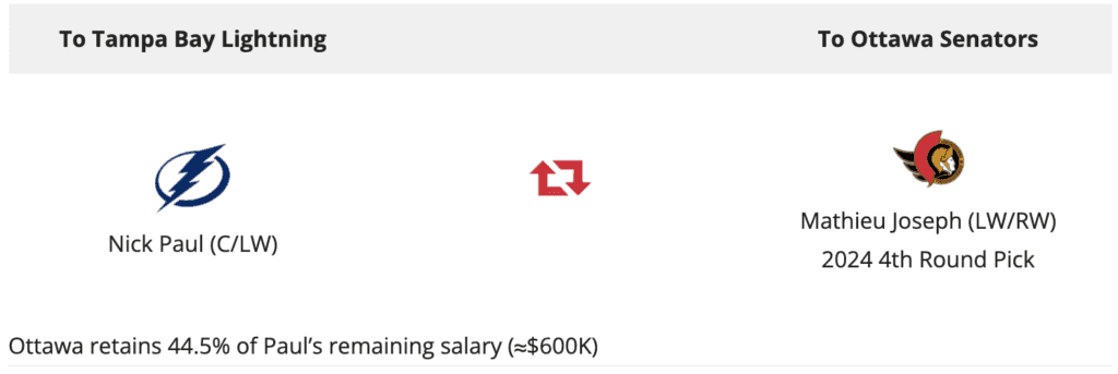 Tampa Bay Lightning acquire Nick Paul from Ottawa Senators for Mathieu Joseph, pick