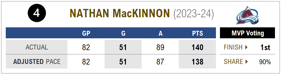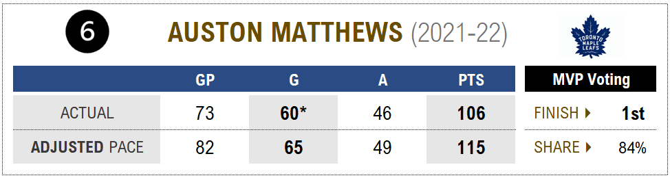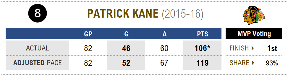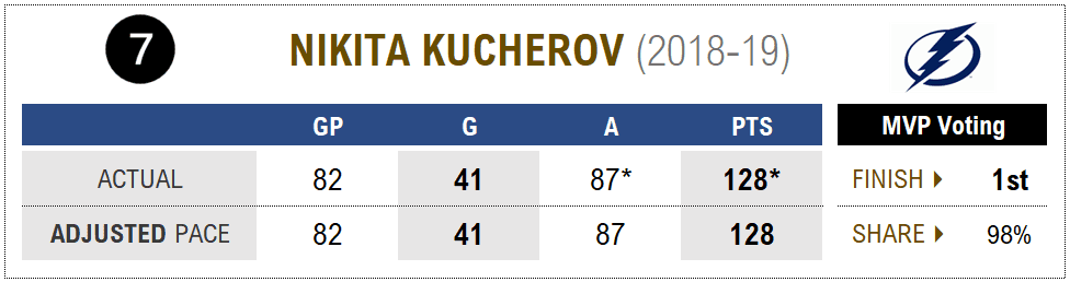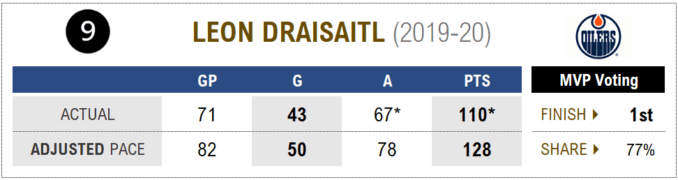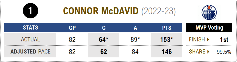 Notes: * led NHL in stat category; Adjusted Pace is a player’s 82-game scoring rate in a neutral scoring environment; MVP Voting Share is a player’s % of the maximum Hart Trophy voting points available