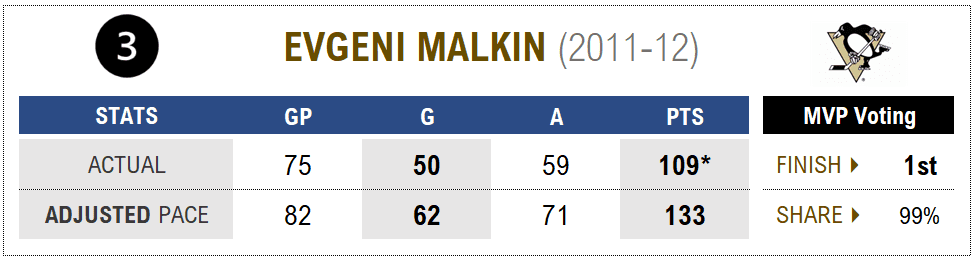 - Steven Stamkos (2011-12) — Adjusted Pace: 68/41/109; MVP: 2nd (40%); Richard Trophy