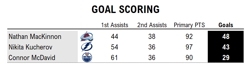Breakdown: When it comes to primary points, Kucherov leads a close race. But while McDavid is putting up scorching assist totals this year, he’s tied for 34th in goals with Blake Coleman and Trevor Moore. And goals, of course, are hockey’s currency. MacKinnon leads McDavid by a whopping 19 goals and Kucherov by five.