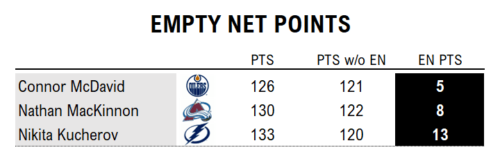 Edge: Clear bump to McDavid (just 5 empty net points) and MacKinnon (8) over Kucherov, earning more of their points by outfoxing an actual NHL goalie.