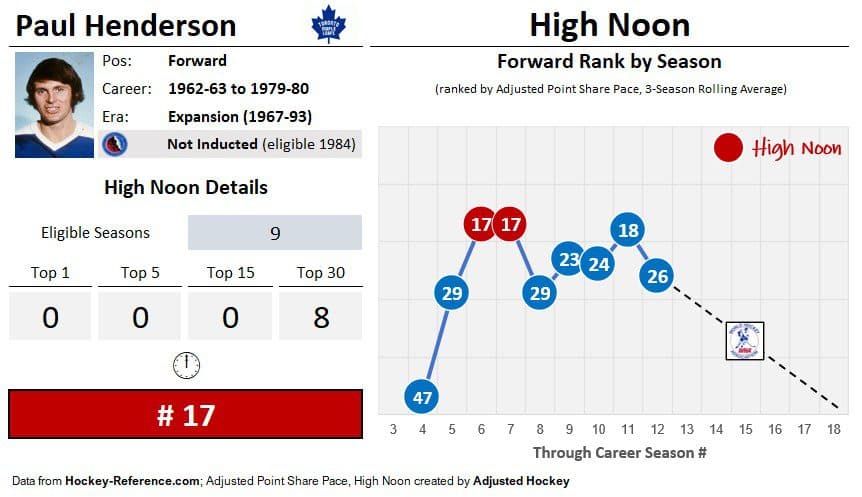 He’s been so famous for so long. But what kind of professional player was Henderson? Stylistically, he was quick and a natural goal scorer. What he lacked in finesse and playmaking skills, he made up for through determination and an early focus on fitness. His High Noon is #17, a respectable slot he held for two years in the late-1960s as the NHL curated its first expansion in a quarter century.