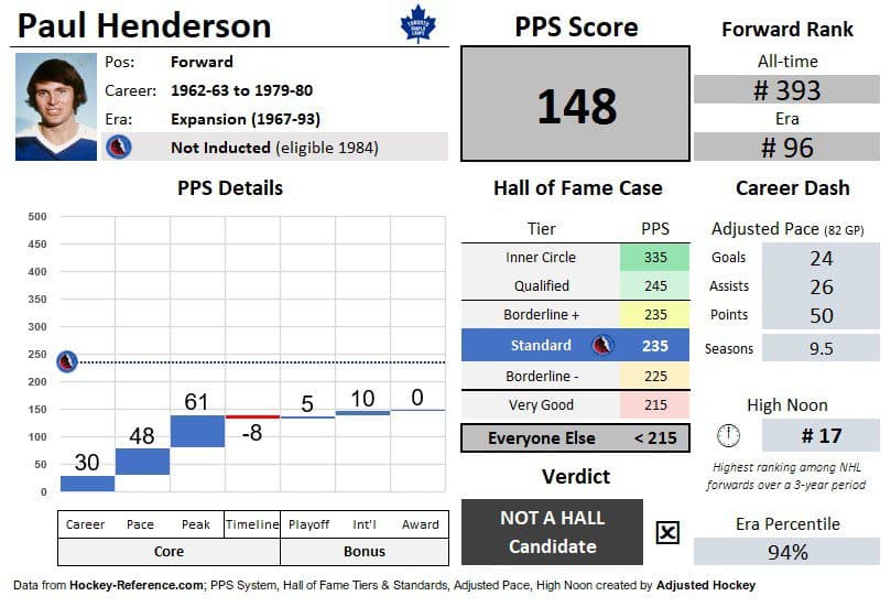 As international hockey events are about two weeks long, PPS allots a maximum 10 points as a bonus. They’re fun, a lot of pride is on the line, but in the grand scheme of a career, it’s a sliver. For Henderson to meet the HHOF standard, we’d have to award another 70 points beyond the max international bonus of 10. He’d need a bonus of 80… out of 10. To many, his moment is immeasurable. But by the numbers, it does feel like we’re trying too hard.