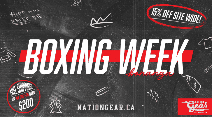 Nation Gear’s Boxing Week Bonanza is BIGGER and BETTER than ever! From Dec 26th-31st, 2023, save 15% on ALL merch & unlock FREE shipping on orders over $200. Check out the collections and grab some gear at nationgear.ca