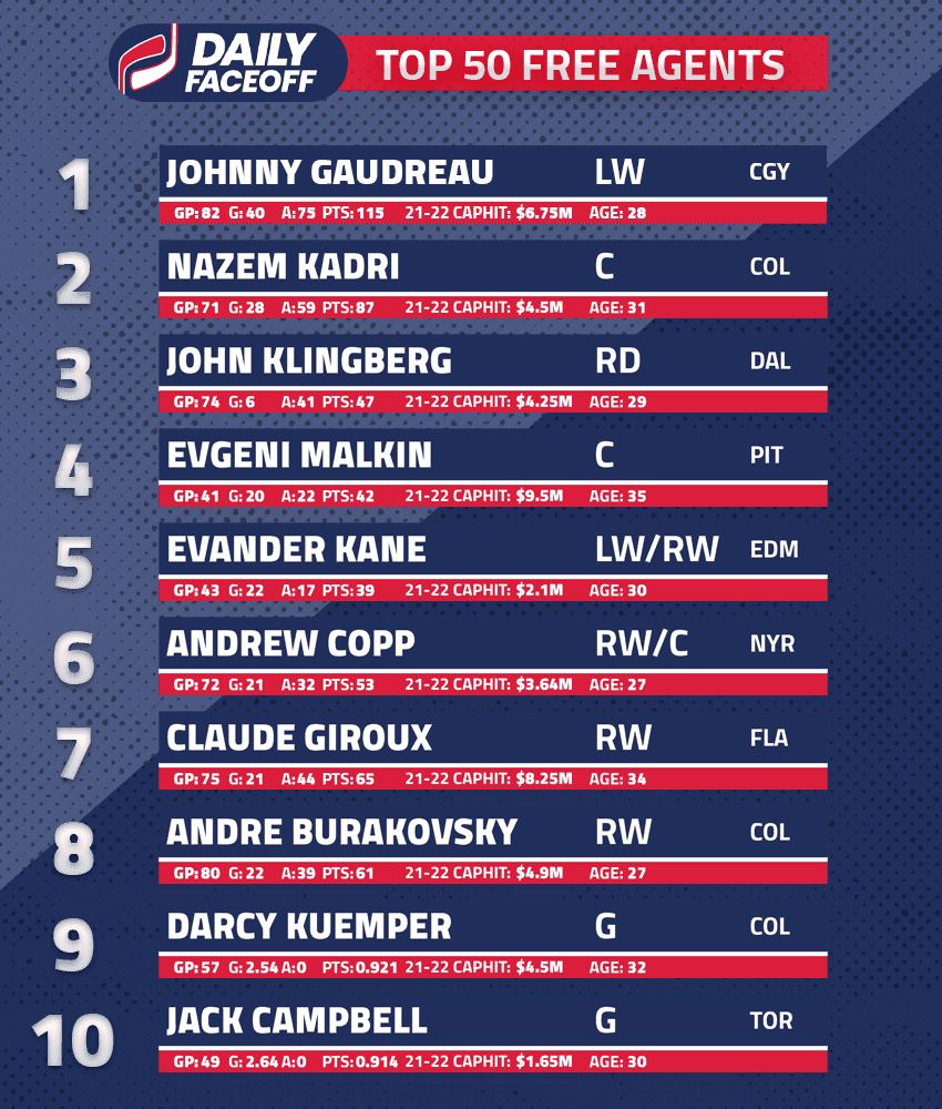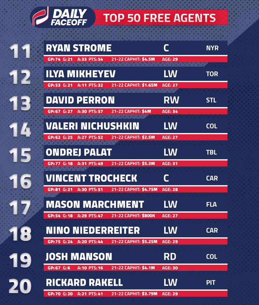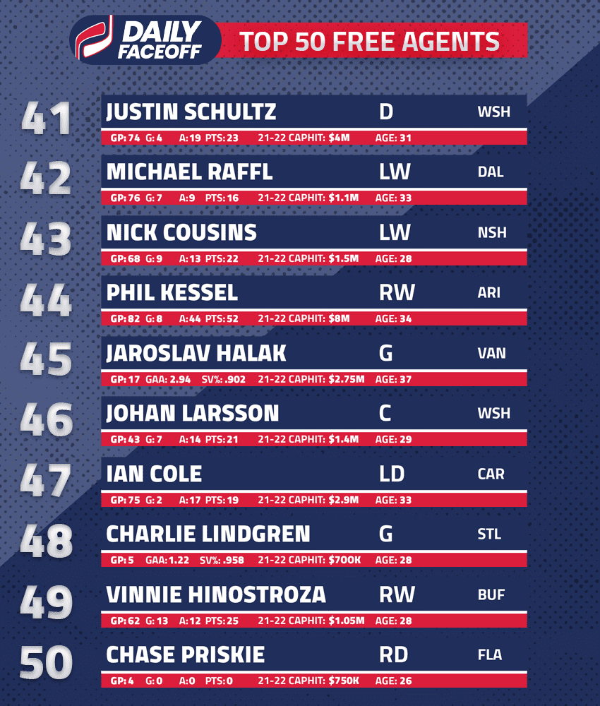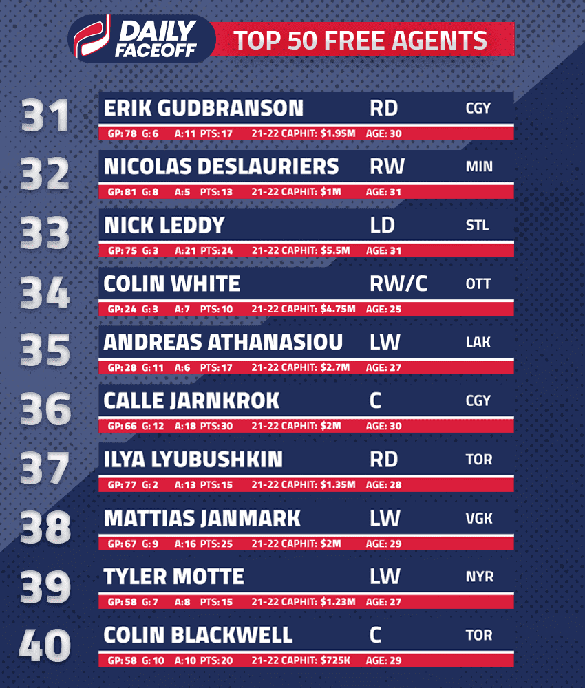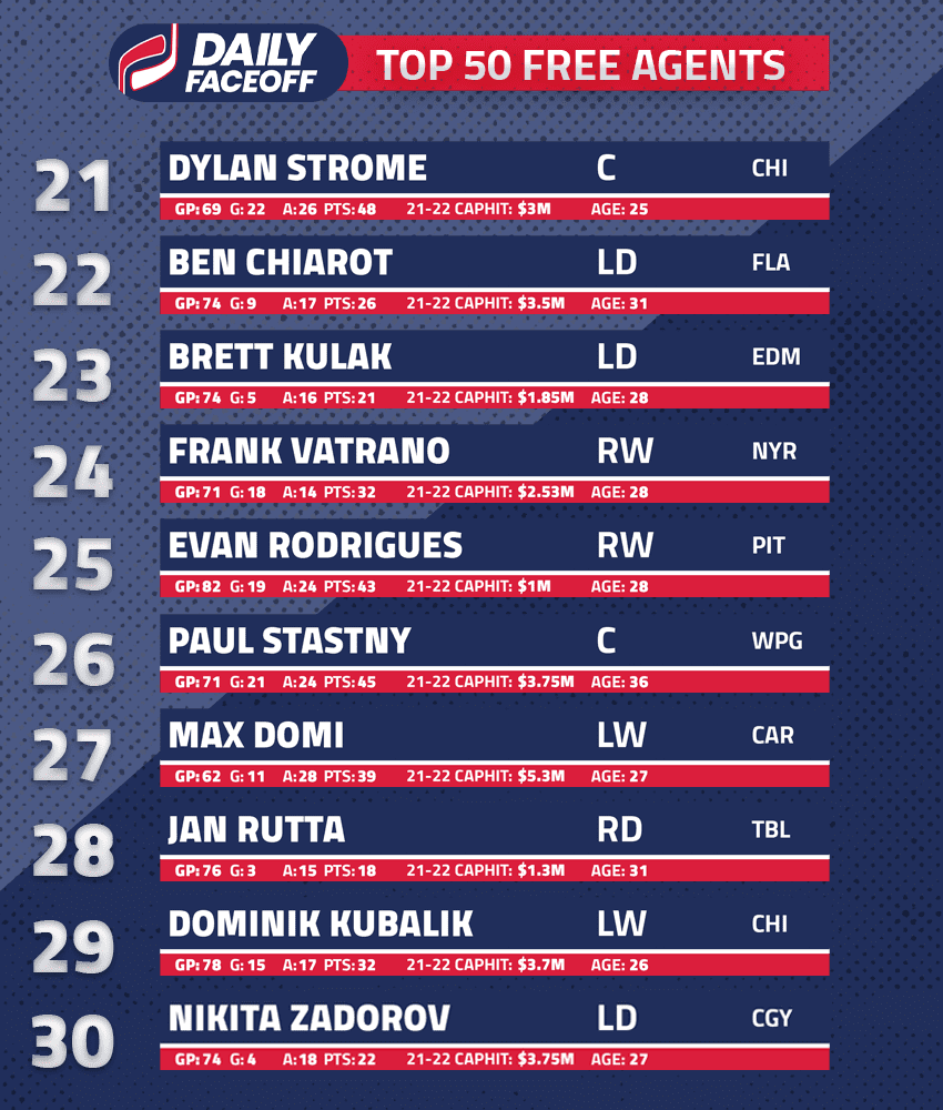 Here’s the latest Daily Faceoff Top 50 Free Agents ahead of Wednesday’s shopping:
