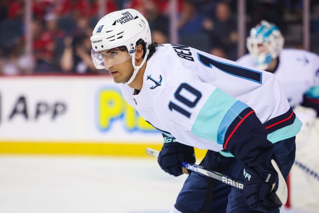 Oct 3, 2022; Calgary, Alberta, CAN; Seattle Kraken center Matty Beniers (10) during the face off against the Calgary Flames during the first period at Scotiabank Saddledome. Mandatory Credit: Sergei Belski-USA TODAY Sports