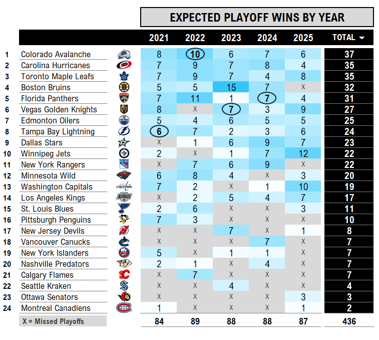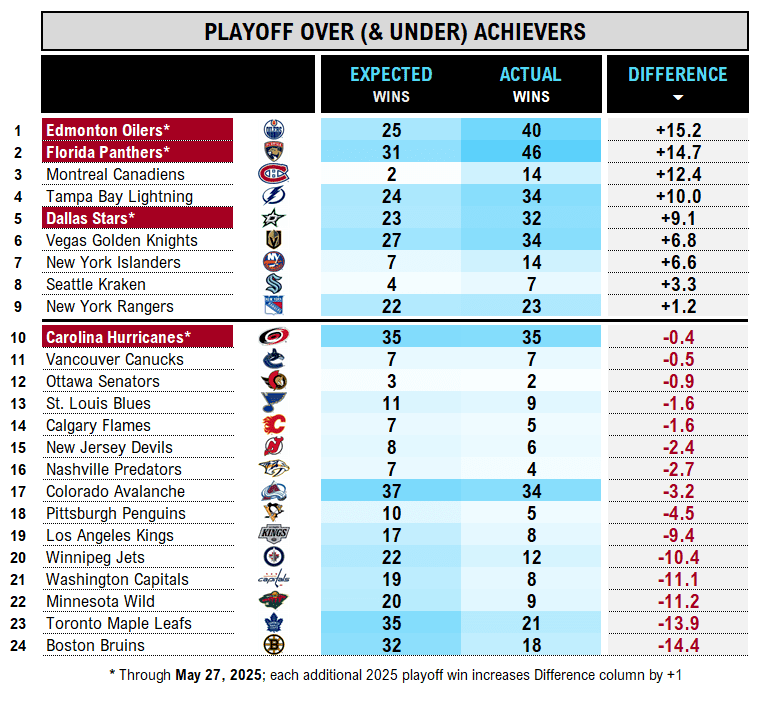 Example: the 2025 postseason will produce about 87 total playoff wins, give or take, depending on how the remaining series play out. Dark horses Montreal and New Jersey (.555 points percentage) get one expected win. The Presidents’ Trophy winner, Winnipeg (.707), is assigned 11.7 expected playoff wins. All other playoff teams get a figure somewhere in between based on their records relative to the field.