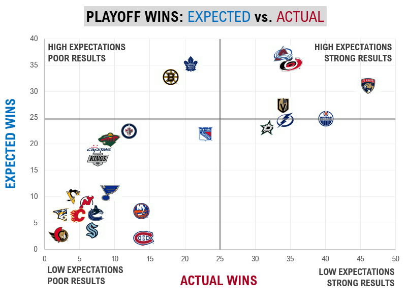 We’ve gone through the NHL’s last five postseasons and identified that year’s 16 playoff teams. The team with the lowest points percentage in the regular season is assigned one expected playoff win as the floor (i.e., an opening round 4-1 series loss). Then, based on each team’s points percentage and the number of playoffs wins available that year, we assign an expected win value to the playoff field.