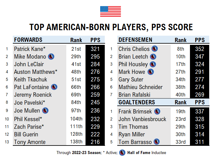 Before we label the greatest American in NHL history, we’ll review the all-time PPS leaderboards. This offers a chance to acknowledge all of the special U.S.-born talent. When comparing players in PPS, positions should be considered separately as each position accumulates value much differently.