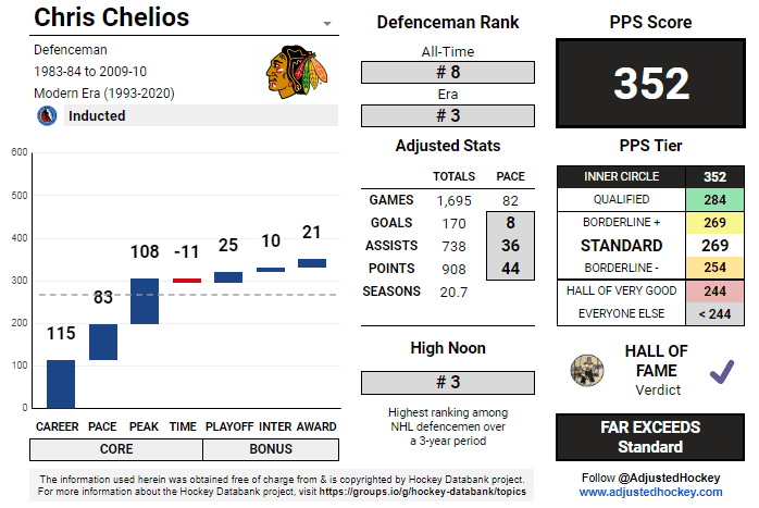 Verdict: In PPS, my Hockey Hall of Fame worthiness score, Chelios grades as the #8 defenseman in NHL history. Leetch is 10th, the pair topped only by Lidstrom and Al MacInnis in their era. That feels right, Chelios getting the slight edge on longevity and team success.