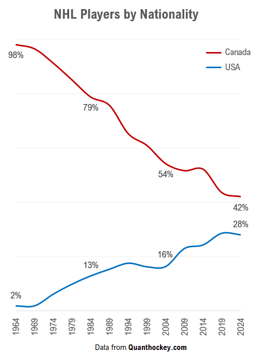 With a U.S. population nearly nine times that of Canada, the per capita gap remains massive. But the gradual shift of the NHL’s composition below is stunning.