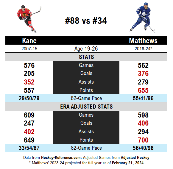 Verdict: We’ve had some fun showing Matthews’ offensive superiority at the same age, but greatest American ever is a lifetime achievement award — Kane leads the pack so far.