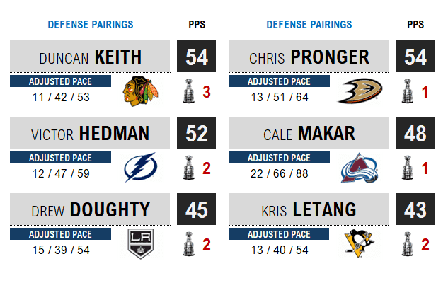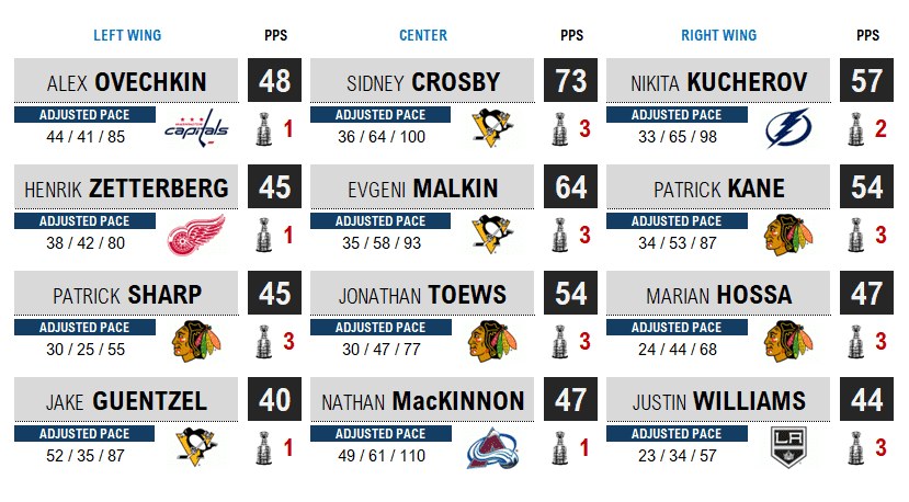 • Pace Value (30): era adjusted playoff points per game, again valuing goals above assists