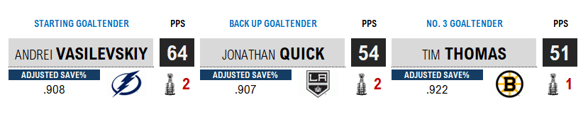 The method for goaltenders is similar, subbing in wins and goals saved above average (GSAA) for Career Value and winning percentage and adjusted save percentage for Pace Value. The bonus for goalies is +1 for each instance of finishing runner-up in the Cup Finals.