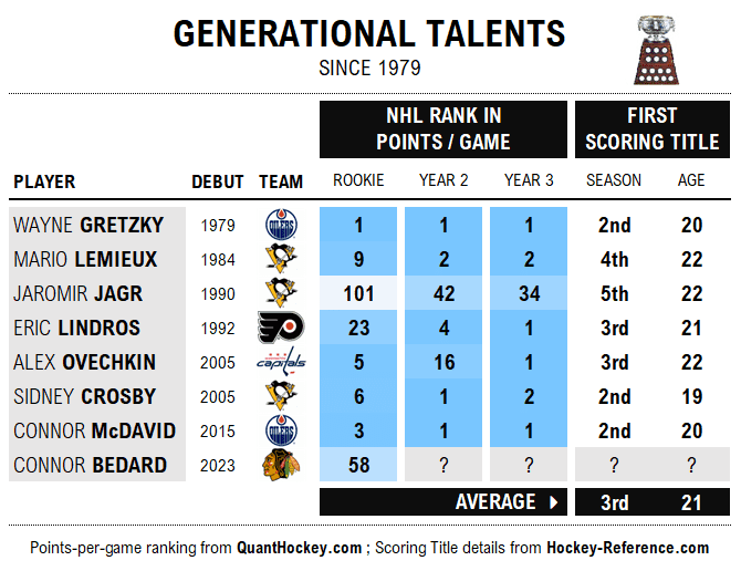 Incredibly, of the seven generational forwards before Bedard, the average result was a scoring title by their third NHL season at an average age of 21.
