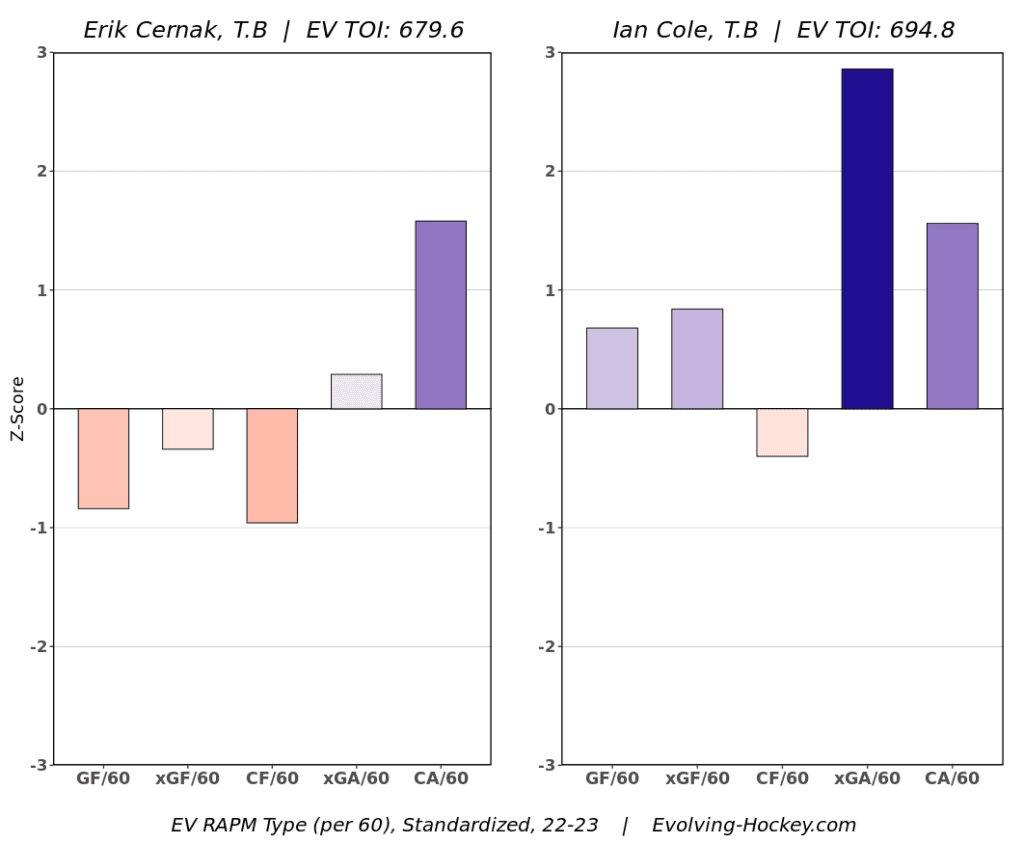 That isn’t all bad, as Cole actually leads Lightning defensemen in 5v5 xGA/60 regularized-adjusted plus-minus (a stat from Evolving Hockey which isolates a players impact on the ice from factors like teammates and competition) with -0.332. Unfortunately for Hedman, though, that’s the guy Cernak plays with, while Hedman gets Bogosian, who is a fine bottom pair defenseman but isn’t meant for a role like this.