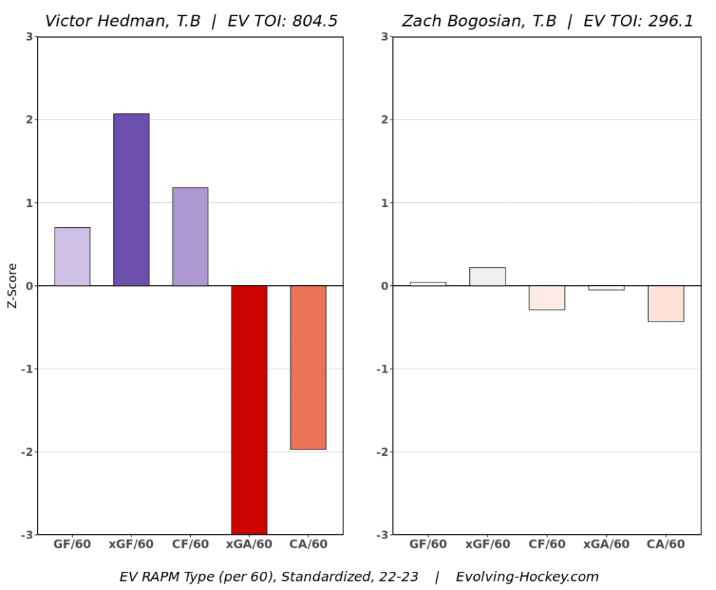 Bogosian’s inability to drive play means that Hedman becomes the focus for opponents. They can put more pressure on Hedman to prevent him from moving the puck and making Bogosian move it more, and since that’s not a skillset that he particularly excels at, it makes it more difficult for that pair to move the puck as efficiently as Hedman is used to.
