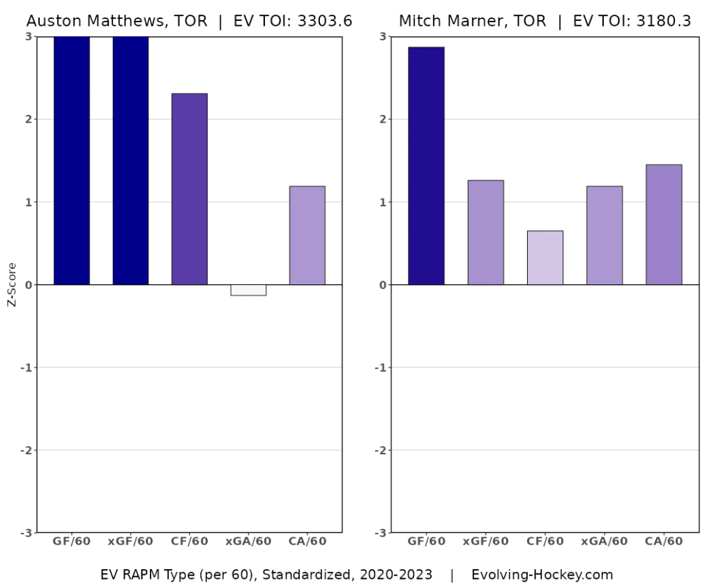 This isn’t normal either. As I alluded to off the top, Matthews and Marner have normally been some of the league’s best play-drivers, and their RAPM from the 2020-21 to 2022-23 seasons indicates the same thing.