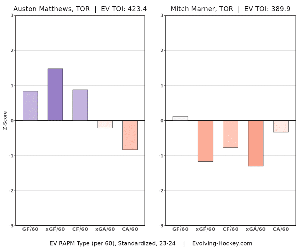 Using the tools we have available to us, yes, it is. The best insight to this is with Evolving Hockey’s Regularized Adjusted Plus-Minus, which isolates their play from other outside factors like teammates, competition, rink bias, etc. Basically, it gives us the best look at how a player may actually be playing. This season, it doesn’t look ideal for Matthews and Marner.