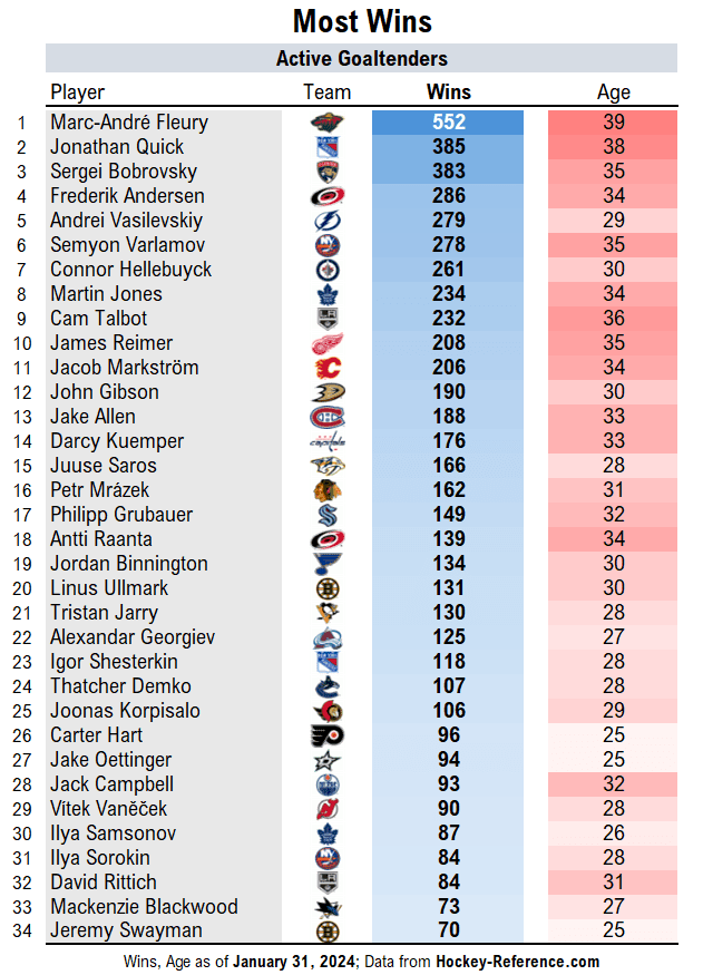 Sports science tells us preserving our greatest athletes is the long-term play. Hard to argue. Many workhorses swing by the glue factory much too early. Times change. Positions evolve. Major League Baseball has likely seen its last pitcher win 300 games. And while the projections collectively say at least one active goaltender should win 500 games, there are no guarantees.