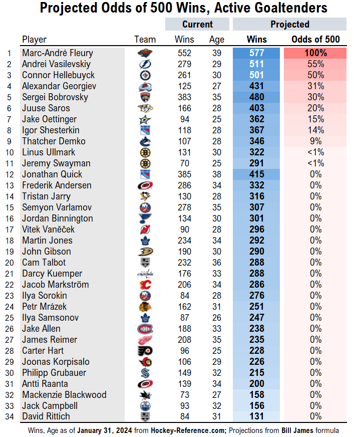 Clearly, there’s no easy road. To guide us, we’re going to use a fun tool developed by baseball statistical godfather, Bill James, his “Favorite Toy.” It’s a simplified method to predict final career totals, using a player’s age, current total, and last three years of weighted results. Only 11 active goalies have a non-zero chance at 500 wins. Let’s see who could join Fleury… if they have a full career.