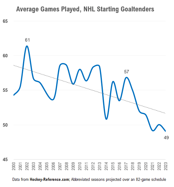 While the league average ebbs and flows, the direction is crystal clear. As recently as 2001-02, an average No. 1 goaltender appeared in 61 games — 75% of the schedule. Just seven years ago (2016-17), starters averaged 57 outings.